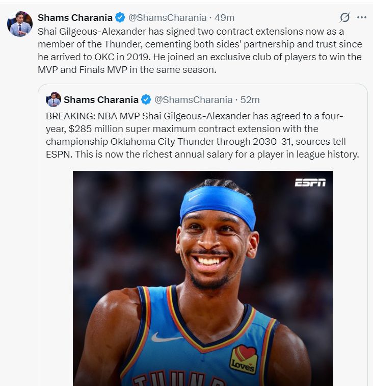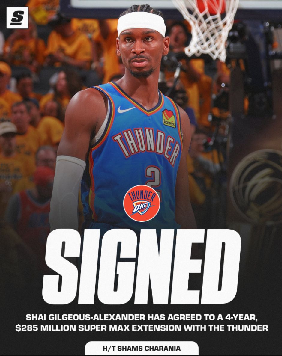 SGA本赛季是大满贯得主:得分王、最佳一阵、常规赛MVP、全明星先发、西决MVP、FMVP,他能得到超级顶薪是应该的,32岁时他又可以去冲击下一份超级顶薪。