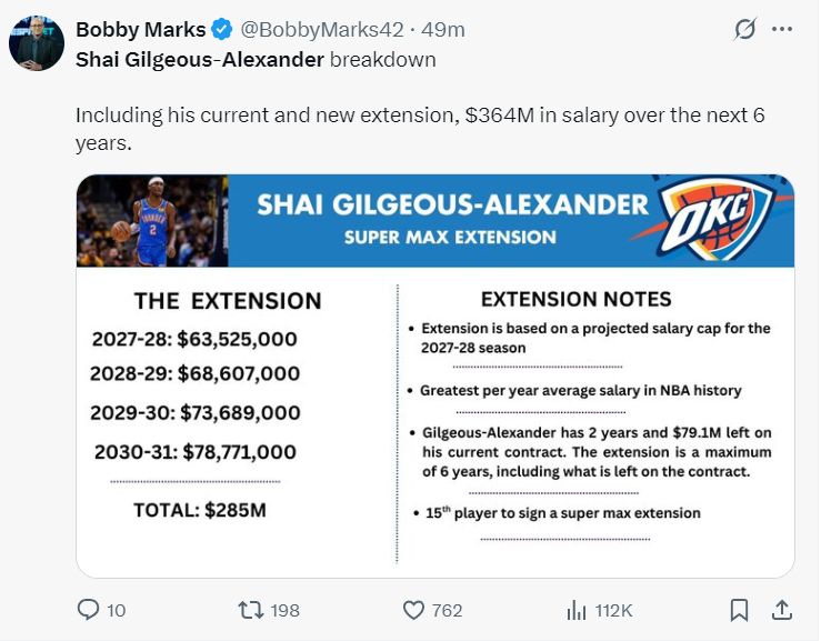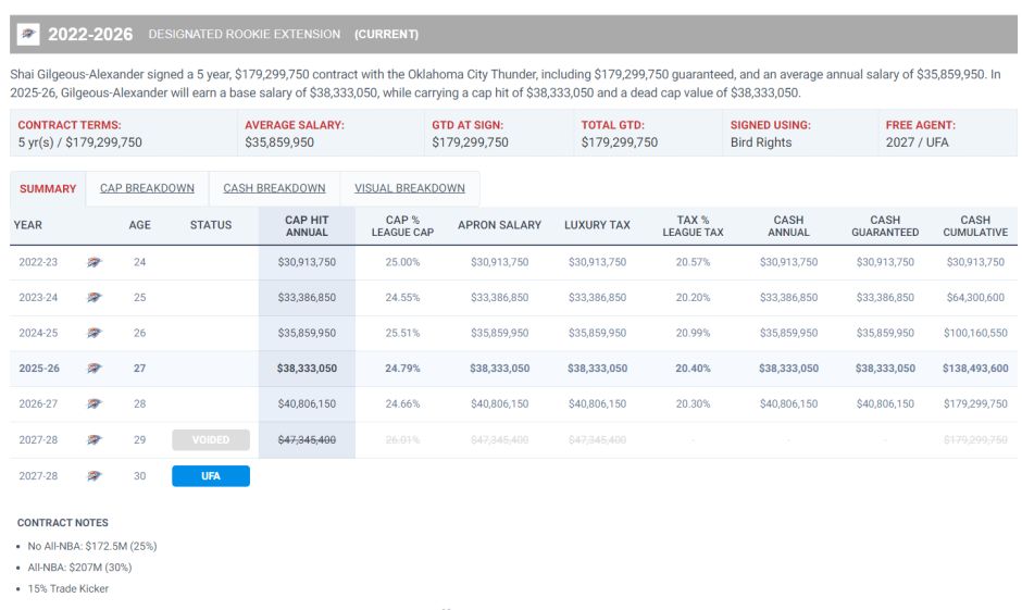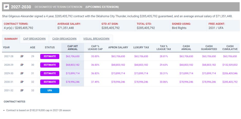 但SGA这份新合同的细节并不简单,他是额定在27-28赛季跳出合同,他原本27-28赛季有价值4734万的球员选项,这里开始上浮薪资。